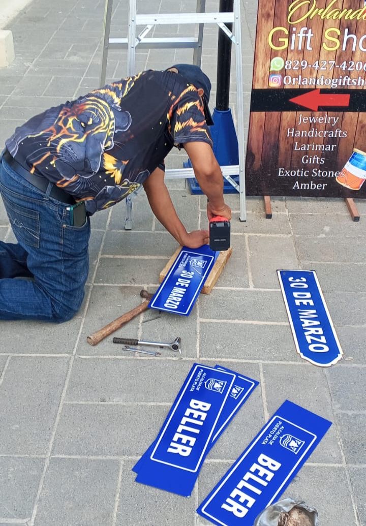 Puerto Plata.– La Alcaldía del municipio San Felipe de Puerto Plata continúa ejecutando los trabajos de señalización y rotulación de las principales calles del Centro Histórico de la ciudad, como parte del plan de ordenamiento vial y embellecimiento urbano que impulsa la actual gestión municipal.